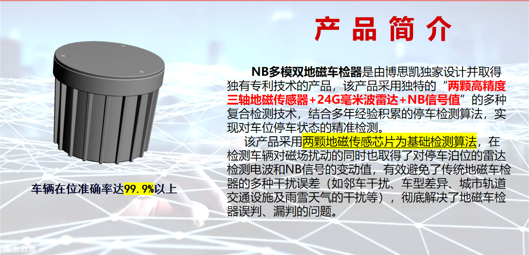 NB-200D多模雙地磁車檢器是專為路邊停車、智能車庫(kù)設(shè)計(jì)的停車檢測(cè)裝置,在雙地磁傳感器融合算法的基礎(chǔ)上增加了毫米波雷達(dá)及NB信號(hào)值檢測(cè)裝置,突破了雙地磁傳感器在干擾和靈敏度上的限制,使得檢測(cè)準(zhǔn)確率提高到99.9%%%u4E0A。